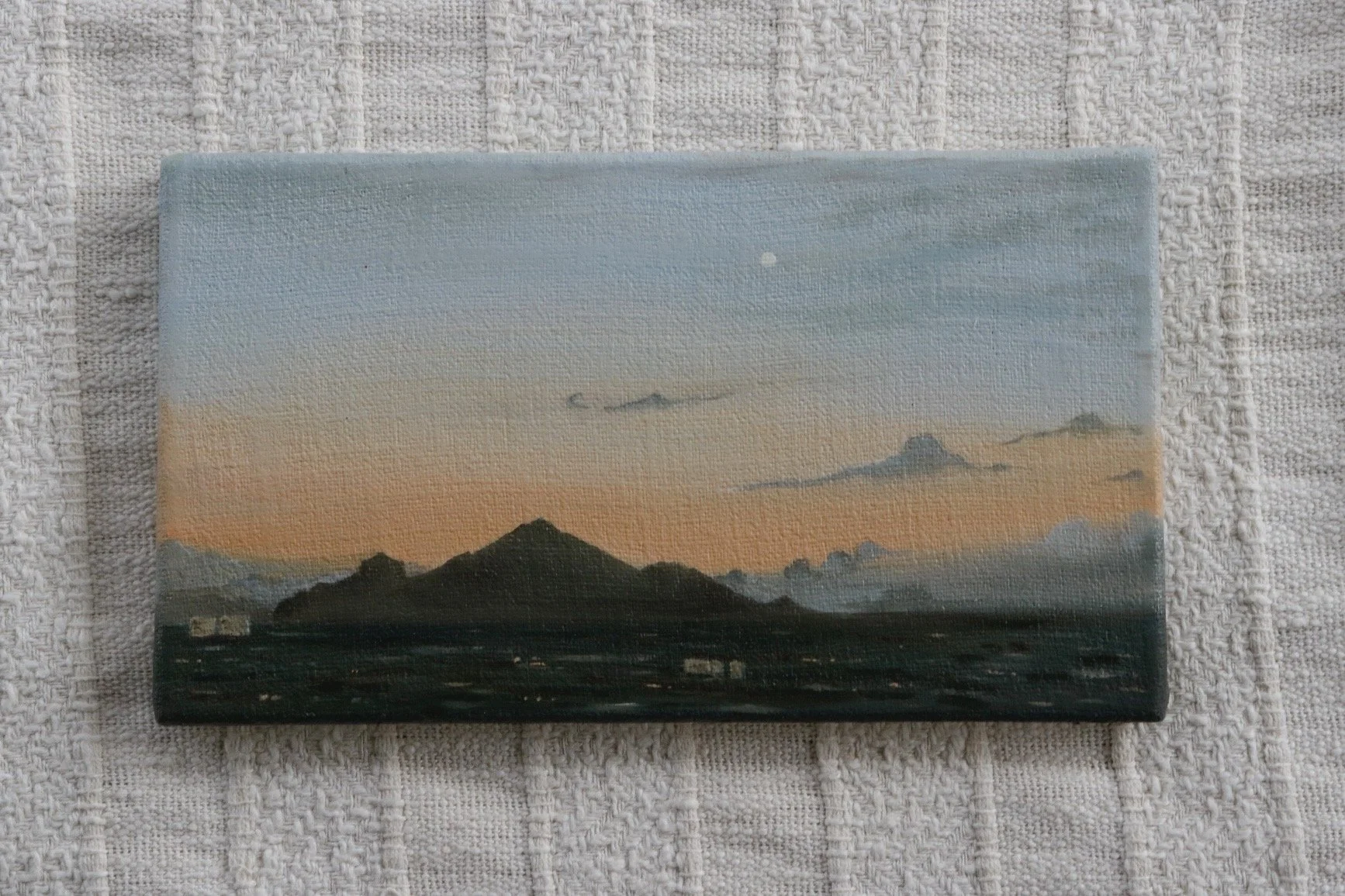 Oil on up-cycled fabric on canvas. 8 x 14 inches. Available.